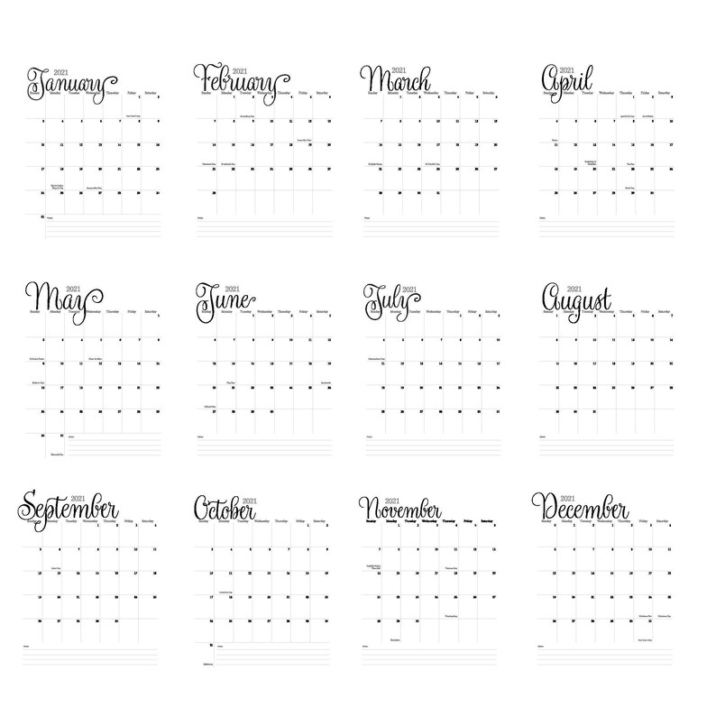2021 modern black & white calendar printable calendar * this listing is for an instant download (digital item) no physical item will be shipped. Select the orientation, year, paper size, the number of calendars per page, etc. These free printable templates are available in microsoft. While printing the template, you can choose paper size a4 or a5, so you print it out. Get monthly printable calendars of every month of this year from january to december to schedule your tasks. Printable 2021 calendar w holidays 2021 printable calendar with holidays free, 2021 printable calendar with holidays one page, free printable 2021 calendar with holidays nz, in case that you need help improving your life, you need to prevent squandering time at all costs. Unlike other calendars, our 2021 calendar is available in.png and.pdf format, for free. Here you can customize any 2021 monthly calendar printable monthly calendar templates. You can edit each 2021 monthly calendar printable all you want, then print, or skip the editing and just straight up print them! These additional yearly calendar designs are great for printing and hanging on your wall or fridge or posting next to your desk for a the yearly 2021 calendar images below were made for you to use as clipart in brochures, reports, documents, and printed calendars. Important note regarding paper size: And since our 2021 calendar prints on 8.5″ x 11″ paper, the possibilities are endless! This template is without holidays.
